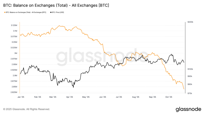 تشير بيانات السلسلة على بيتكوين إلى ضغط بيع محدود. إذ تستمر أرصدة البيتكوين في المنصات بالانخفاض، ما يدل على استمرار عملية التجميع.