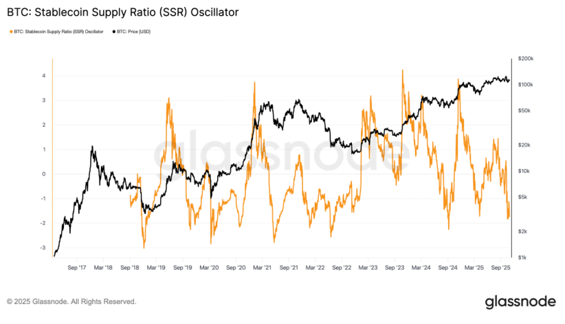 بالإضافة إلى ذلك، يظل مؤشر نسبة عرض البيتكوين إلى العملات المستقرة (BTC: Stablecoin Supply Ratio – SSR) عند مستويات منخفضة (القيم الأعلى تشير إلى ضغط بيع أكبر، والمنخفضة إلى أقل). بالنسبة للمستثمرين على المدى الطويل، تظل أساسيات البيتكوين قوية نسبيًا.