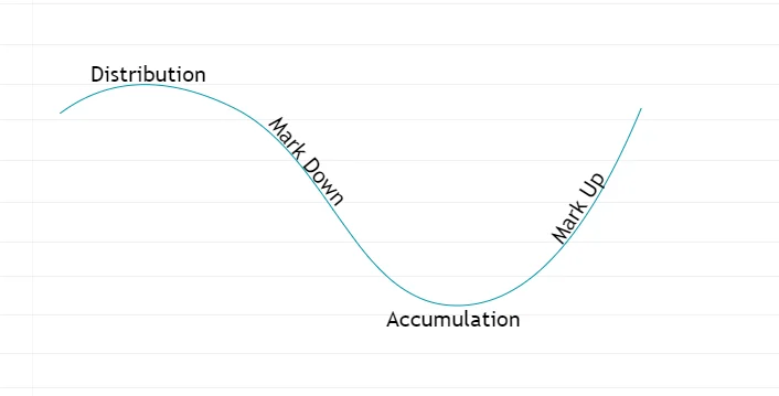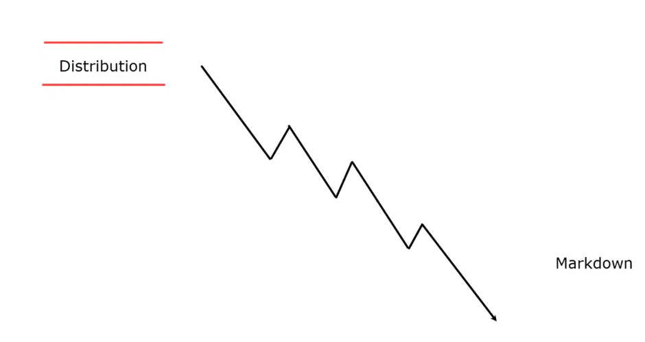 تلي مرحلة التوزيع وتشهد تراجعات حادة مع زيادة أحجام البيع بسبب الذعر. يستخدم المتداولون هذه المرحلة إما للبيع على المكشوف أو للانتظار حتى تبدأ دورة جديدة.