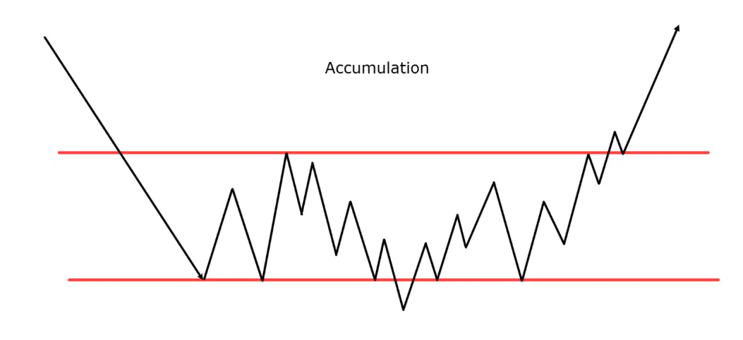 تتحرك الأسعار بشكل جانبي في نطاق ضيق بينما تقوم المؤسسات بالشراء بهدوء. تظهر هذه المرحلة عادة بعد السوق الهابطة وتتميز بانخفاض الحجم والتقلبات.