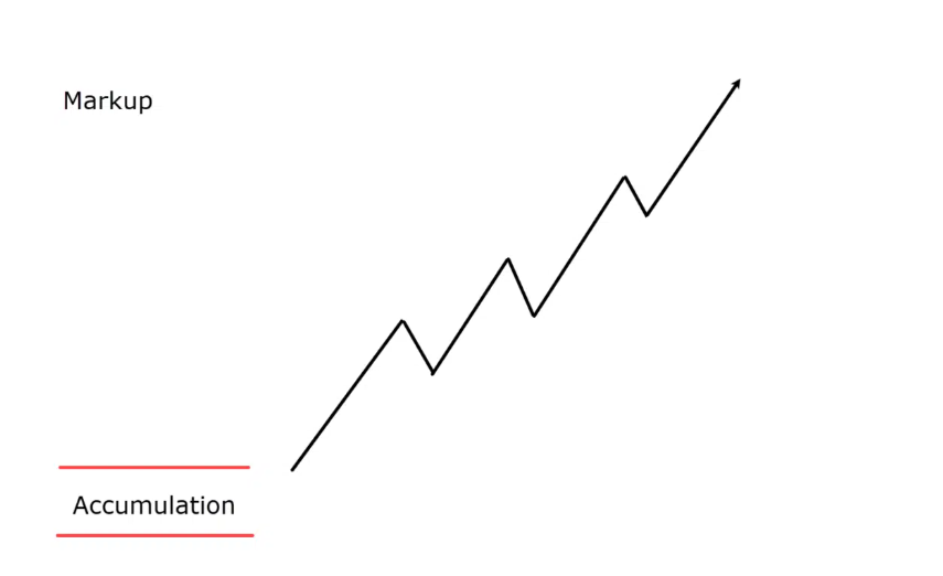 تبدأ بعد انتهاء التراكم، حيث ترتفع الأسعار ويزداد التفاؤل ويزيد حجم التداول. يسعى المتداولون في هذه المرحلة إلى ركوب الاتجاه الصاعد مع إدارة المخاطر.