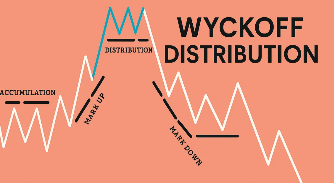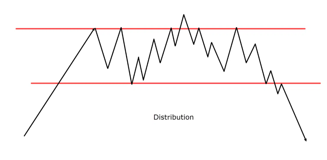 يبدأ كبار المستثمرين في بيع أصولهم للجمهور، مع بقاء الأسعار قرب القمم وظهور ضعف في الزخم الشرائي. تكثر فيها الاختراقات الكاذبة وتزداد التقلبات.