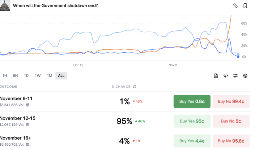 كما أن نهاية أطول إغلاق حكومي في تاريخ الولايات المتحدة تبدو قريبة، إذ تشير بيانات Polymarket إلى وجود احتمال بنسبة 95٪ لاستئناف العمليات الحكومية بين 12 و15 نوفمبر.