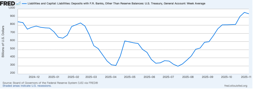 خلال فترة الإغلاق، تراكم في حساب الخزانة العامة الأمريكي نحو تريليون دولار من الأموال غير المنفقة. ومع استئناف الأنشطة الطبيعية، ستُعاد هذه الأموال إلى الدورة الاقتصادية، مما يخفف من ضغوط السيولة في الأسواق المالية. بالنسبة للعملات الرقمية، قد يؤدي ذلك إلى تقليل ضغط البيع المرتبط بالسيولة وتشجيع عودة اهتمام المؤسسات.