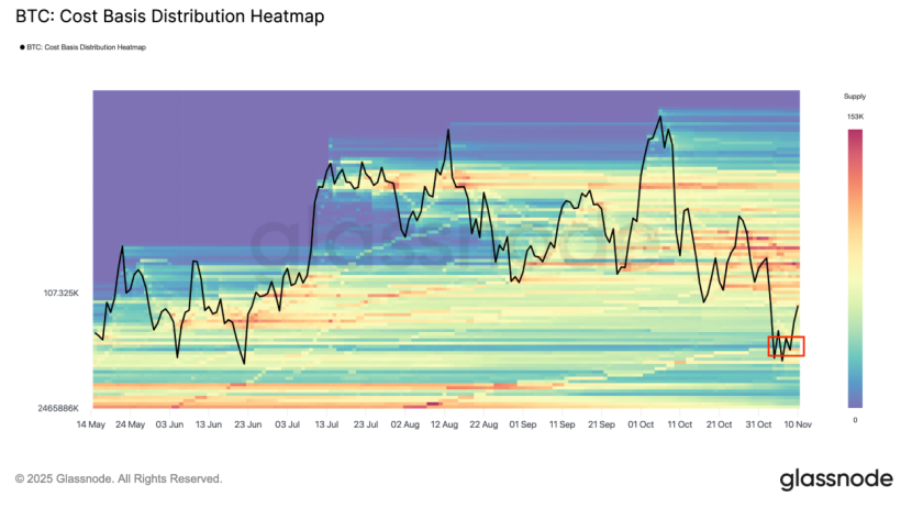 خلال هبوط الأسبوع الماضي، برزت موجة شراء قوية عند مستوى 102 ألف دولار. تشير بيانات Glassnode إلى أن كمية البيتكوين ذات التكلفة الأساسية عند هذا المستوى ارتفعت من نحو 60 ألف بيتكوين يوم الخميس إلى ما يقارب 100 ألف خلال 24 ساعة فقط. هذا التراكم السريع يعكس شراءً مكثفًا من المستثمرين الذين يرون هذا النطاق دعمًا قويًا، وهو سلوك شائع خلال مراحل التصحيح وغالبًا ما يساعد على تشكيل قاع سعري يحد من المزيد من الهبوط.
