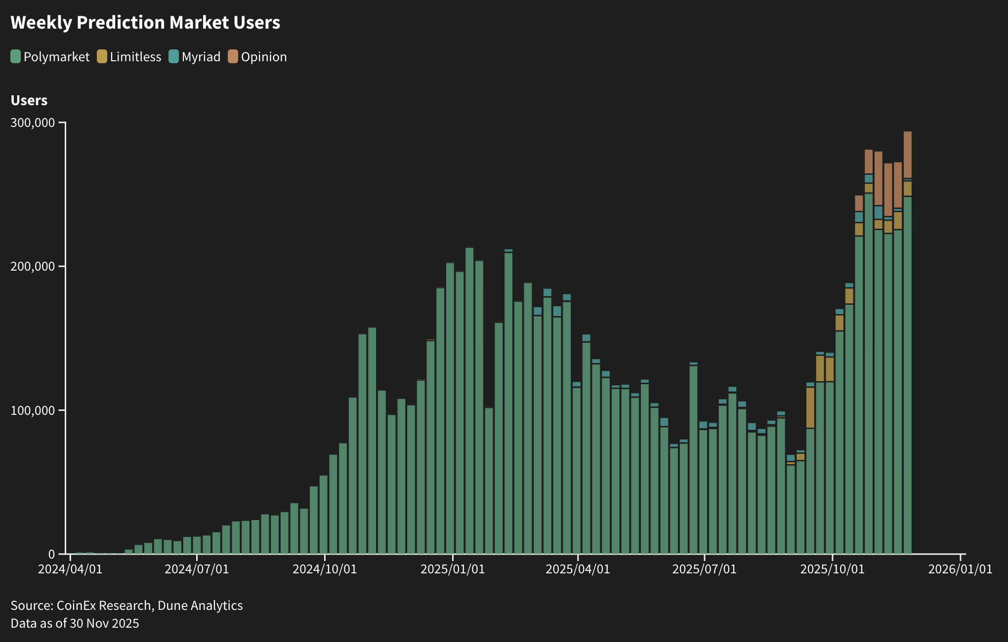 تجاوز الحجم الأسبوعي لأسواق التنبؤ 3.6 مليار دولار في شهر نوفمبر، متخطيا بشكل كبير ذروة انتخابات 2024. ومن وجهة نظرنا، نجح السوق في الانتقال من نموذج قائم على الأحداث إلى مرحلة السيولة العالية المستقرة