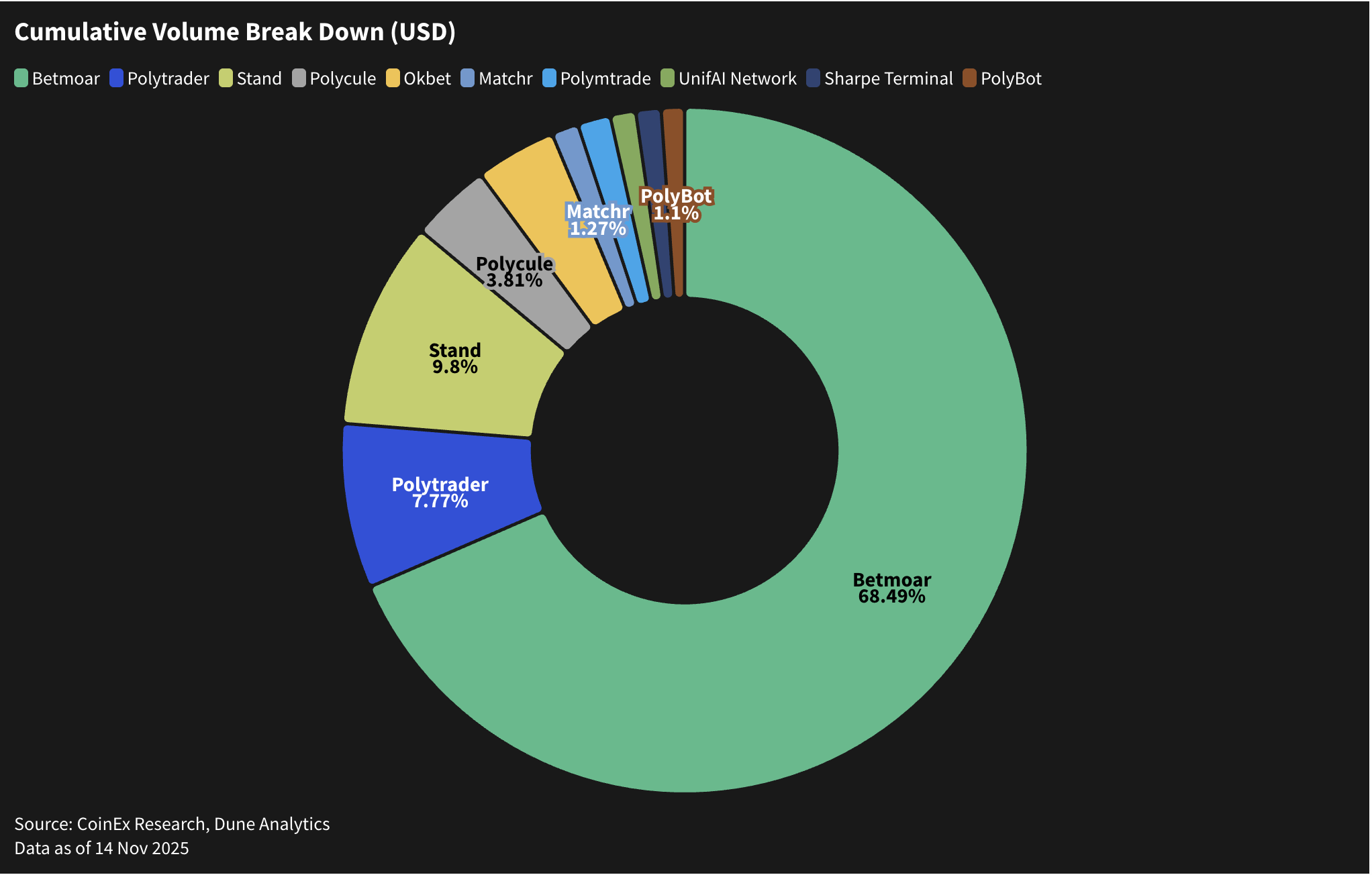 الذيل الطويل الاستراتيجي: تحتفظ المشاريع ذات الذيل الطويل المتبقية بحوالي 14% من الحجم، مثل Polycule وMatchr.xyz. ورغم صغر حجمها، فإن هذه الواجهات المستقلة تمثل عنصرا أساسيا في تعزيز مقاومة الرقابة لدى Polymarket وانتشارها في الأسواق العالمية.