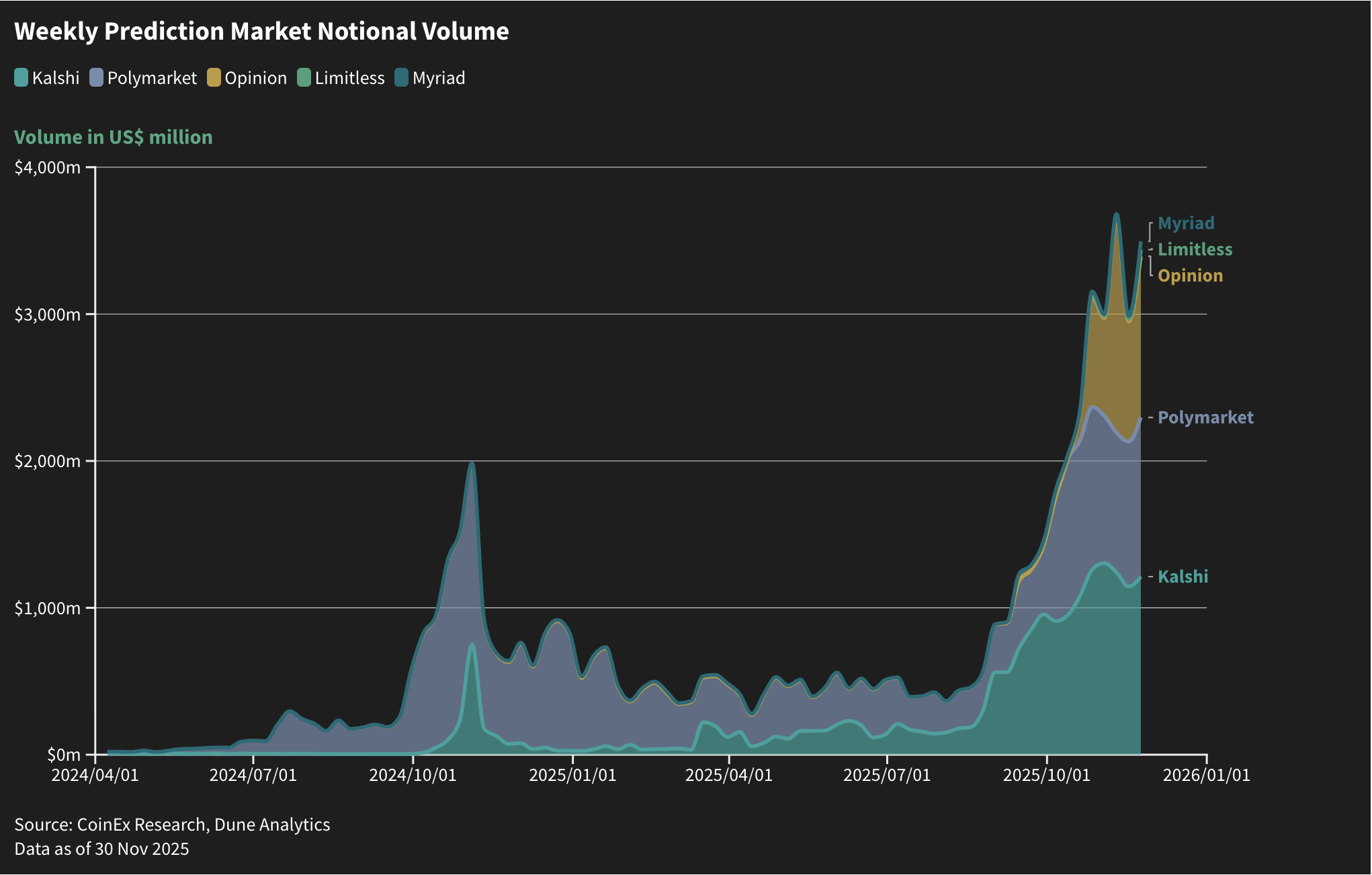 تجاوز الحجم الأسبوعي لأسواق التنبؤ 3.6 مليار دولار في شهر نوفمبر، متخطيا بشكل كبير ذروة انتخابات 2024. ومن وجهة نظرنا، نجح السوق في الانتقال من نموذج قائم على الأحداث إلى مرحلة السيولة العالية المستقرة