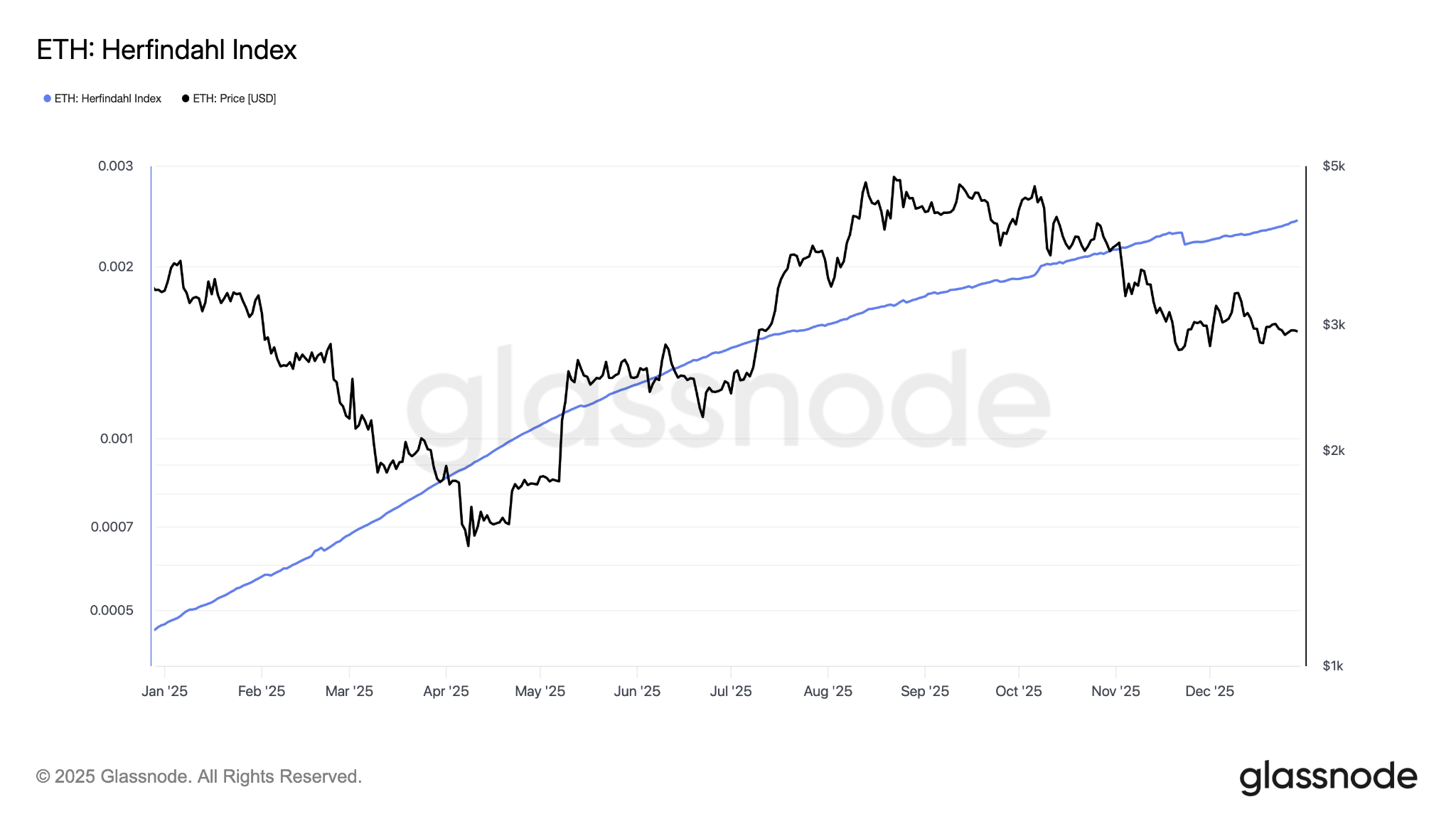 إضافة إلى ذلك، يوفر مؤشر هيرفيندال الذي يقيس تركّز الحيازات رؤية أعمق لسلوك المستثمرين. فبعد تراجع قصير في أواخر نوفمبر وبداية ديسمبر، عاد المؤشر إلى الاتجاه الصاعد. يشير ذلك إلى استمرار تراكم الحيتان والمؤسسات دون توزيع كبير. هذا الشراء المستدام من اللاعبين الكبار يبني طاقة كامنة لارتفاعات محتملة، ويدعم قدرة إيثريوم على تحقيق مكاسب مع دخول 2026.